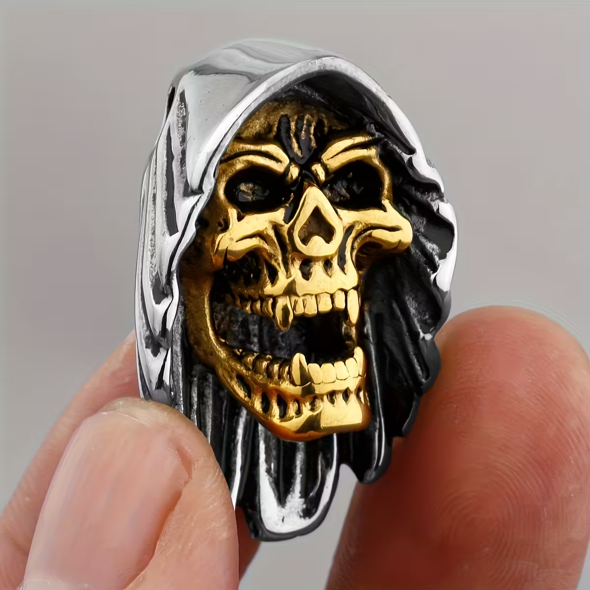 • Detailed hooded skull with gold and silver tones