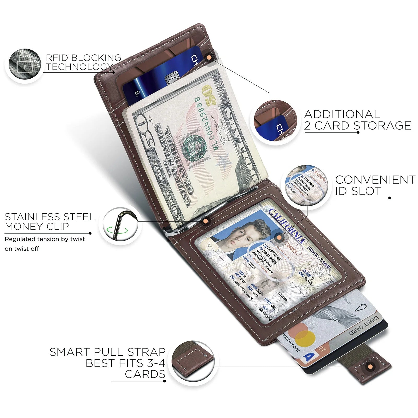 • Built-in clip for quick cash access